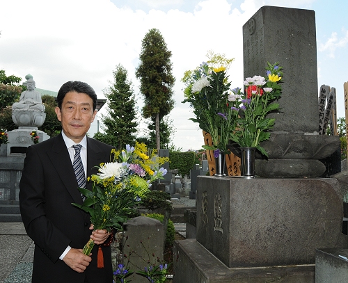 国立劇場10月歌舞伎公演『塩原多助一代記』で塩原多助と道連れ小平の善悪二役を演じる坂東三津五郎が、萬年山東陽寺(足立区東伊興4-4-1)にある塩原太助のお墓参りを行い、舞台への思いを語りました。