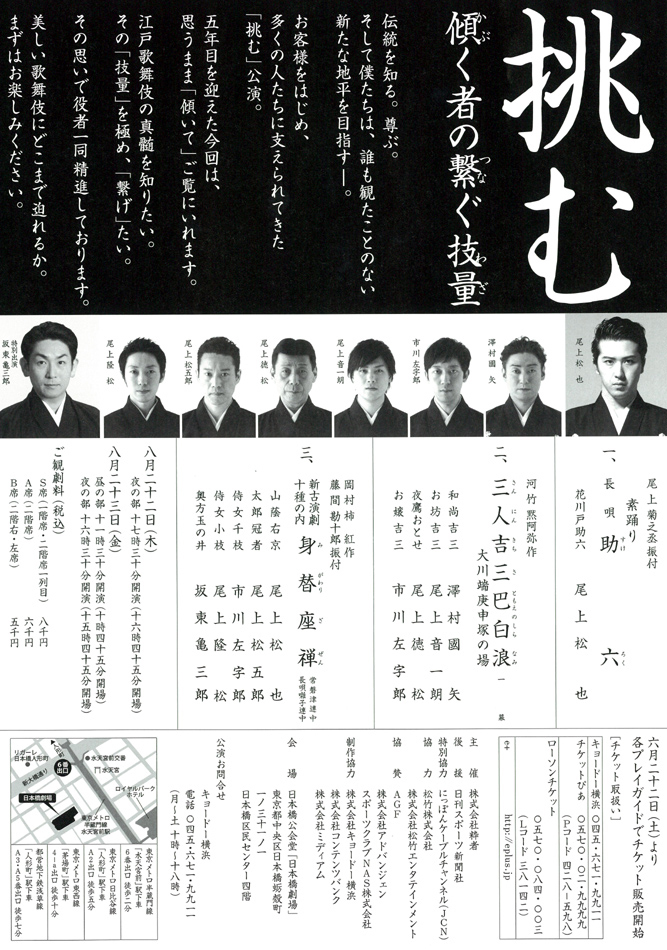 第一回から出演している、澤村國矢、市川左字郎、尾上音一朗、一門の尾上徳松、尾上松五郎、尾上隆松に加え、坂東亀三郎が特別出演。五年目を迎えた今回は、思うまま「傾いて」ご覧にいれます。
