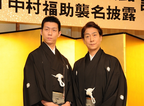 会見には福助、児太郎、六代目歌右衛門の息子である 中村梅玉、松竹株式会社の迫本淳一社長と安孫子正専務取締役演劇本部長が出席。福助は「最初お話しを伺った時は、夢だと思いました。六代目の叔父に憧れ、目標にして女方として歩んできたので、その名を襲名させていただくのは身の引き締まる思いです。名の大きさは父(七代目中村芝翫)からもずっと聞かされ、また、それを守ってきた六代目の素敵さを身に染みて感じています。心の師、芸の師でもあった方の名に追いつけるよう、ただただ頑張るのみです」とやや緊張の面持ちで挨拶。児太郎は「生まれた時から父が福助だったので、その名を継がせていただくのはありがたいです。まだ未熟者ですが、福助と呼ばれても違和感のない俳優になれるよう、一所懸命つとめます」と若手らしいまっすぐな姿勢で挨拶しました。また梅玉は「ここまでこぎつけましたのも、皆様のご尽力、歌右衛門の名を大事に思ってくださった諸先輩の皆様の同意があってこそと感謝しております。これで父六代目をはじめ、芝翫の兄、また先祖に顔向けができると、ホッとしています。これからは加賀屋(中村魁春・ 中村東蔵・ 中村松江)や高砂屋の私も含めた一門でさらに結束して、成駒屋の発展のために力を尽くします」と、感慨深そうな表情で語りました。