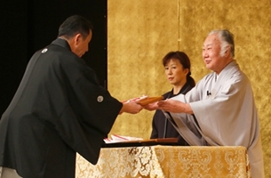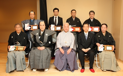 表彰式には日本俳優協会会長の 坂田藤十郎、同専務理事の 中村吉右衛門、来賓として松竹(株)専務取締役の安孫子正氏が出席。藤十郎会長から各受賞者に賞牌と副賞が贈られ、安孫子氏からご祝辞をいただいた後、吉右衛門専務理事の手締めでお開きとなりました。