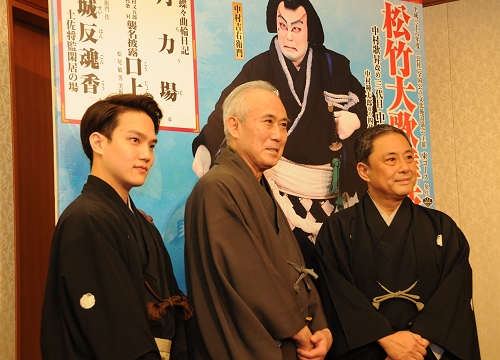 東コース(6月30日~7月31日)】では「松竹大歌舞伎 中村歌昇改め三代目中村又五郎襲名披露 中村種太郎改め四代目中村歌昇襲名披露」を上演します。演目は『双蝶々曲輪日記 角力場(すもうば)』『襲名披露口上』『傾城反魂香(けいせいはんごんこう) 土佐将監閑居の場』の3演目。上演に先立ち、中村吉右衛門、中村又五郎、中村歌昇が公演への思いを語りました。