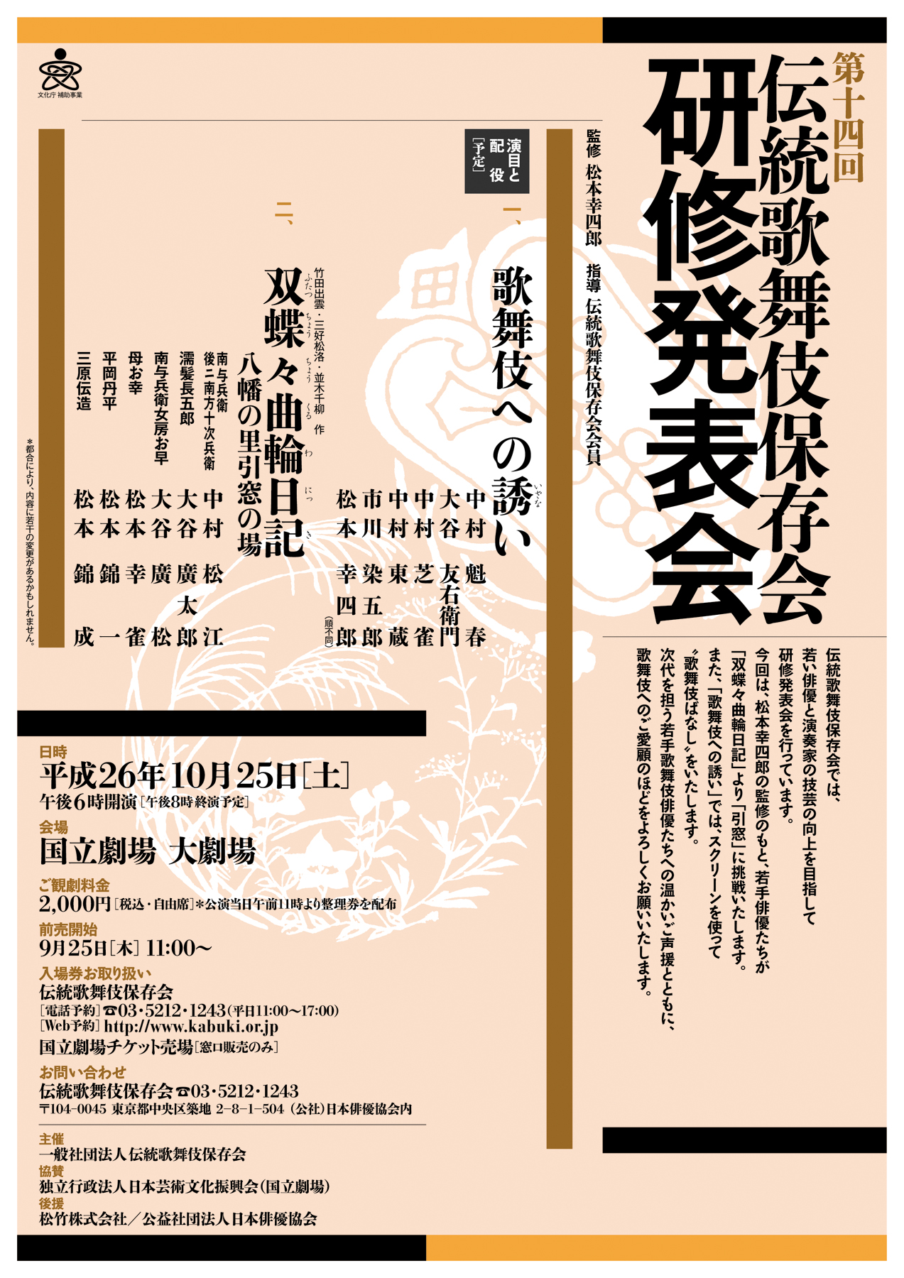 平成26年10月25日(土)、伝統歌舞伎保存会主催 第14回「研修発表会」が、国立劇場大劇場で開催されます。