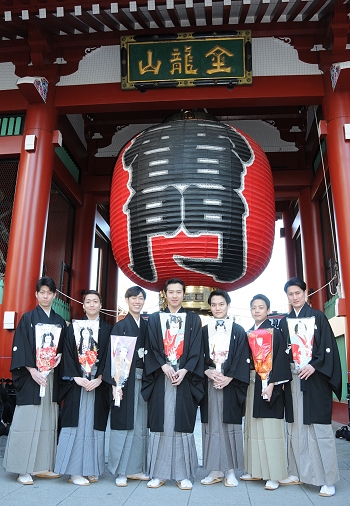 新春浅草歌舞伎」に出演する尾上松也、中村歌昇、坂東巳之助、中村種之助、中村米吉、中村隼人、中村児太郎が勢揃い!花形7人を模した羽子板を手に、意気込みを披露しました。