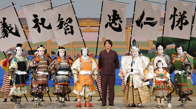 幕切れには、若手書道家・武田双雲氏が揮毛した「仁義礼智忠信孝悌」の8本の旗指物(はたさしもの)が舞台に翻ります。この演出は、菊五郎が思いつき、双雲の書道教室に通う菊之助が頼んで実現したもの。双雲氏は「未年だけに、ひつじの毛で書かせていただきました。ひつじの毛は柔らかいので柔らかさを、さらに新春ですから勢いも必要です。柔らかさと勢い、両方が表現できたら、と思って描きました」。