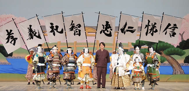 舞台稽古を終えた菊五郎は、「初春の歌舞伎ということで、気持ちも高ぶっております。お正月の国立劇場は、何でも有りの、勇ましい、お正月らしい舞台です。お客様からも力をいただき、私どももお客様に力を与えたい、そういう舞台ができればと思っております」と意気込みを披露。幕切れには、若手書道家・武田双雲氏が揮毛した「仁義礼智忠信孝悌」の8本の旗指物(はたさしもの)が舞台に翻ります。この演出は、菊五郎が思いつき、双雲の書道教室に通う菊之助が頼んで実現したもの。双雲氏は「未年だけに、ひつじの毛で書かせていただきました。ひつじの毛は柔らかいので柔らかさを、さらに新春ですから勢いも必要です。柔らかさと勢い、両方が表現できたら、と思って描きました」。