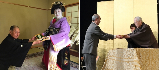写真下左)左より坂東羽之助、坂田藤十郎会長