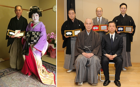 表彰式には日本俳優協会専務理事の 中村吉右衛門、来賓として松竹(株)取締役副社長の安孫子正氏が出席。吉右衛門専務理事から各受賞者に賞牌と副賞が贈られ、安孫子氏からご祝辞をいただいた後、吉右衛門専務理事の手締めでお開きとなりました。