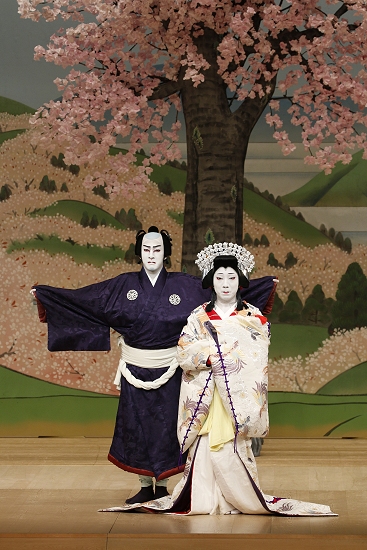 劇場は満員の大盛況!はじめの演目は『義経千本桜 吉野山』。「清元の家に生まれた身として清元の踊りを勉強いたしたく、父・延寿太夫の協力を得て勤めたい」と選んだ演目。幕開きに市川猿之助演じる静御前が舞台で待つところに、尾上右近の佐藤忠信(実は狐忠信)が花道スッポンから登場。満開の桜のなか、二人の踊りは錦絵のような美しさ!