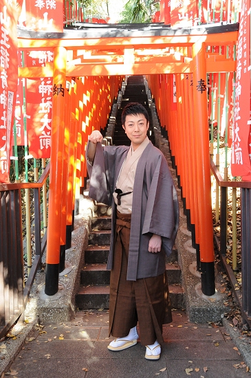 通し狂言 小春穏沖津白浪-小狐礼三-(こはるなぎおきつしらなみ こぎつねれいざ)』で小狐礼三を勤める尾上菊之助が、舞台となる赤坂・日枝神社を訪れ、舞台の安全と成功を祈願しました。
