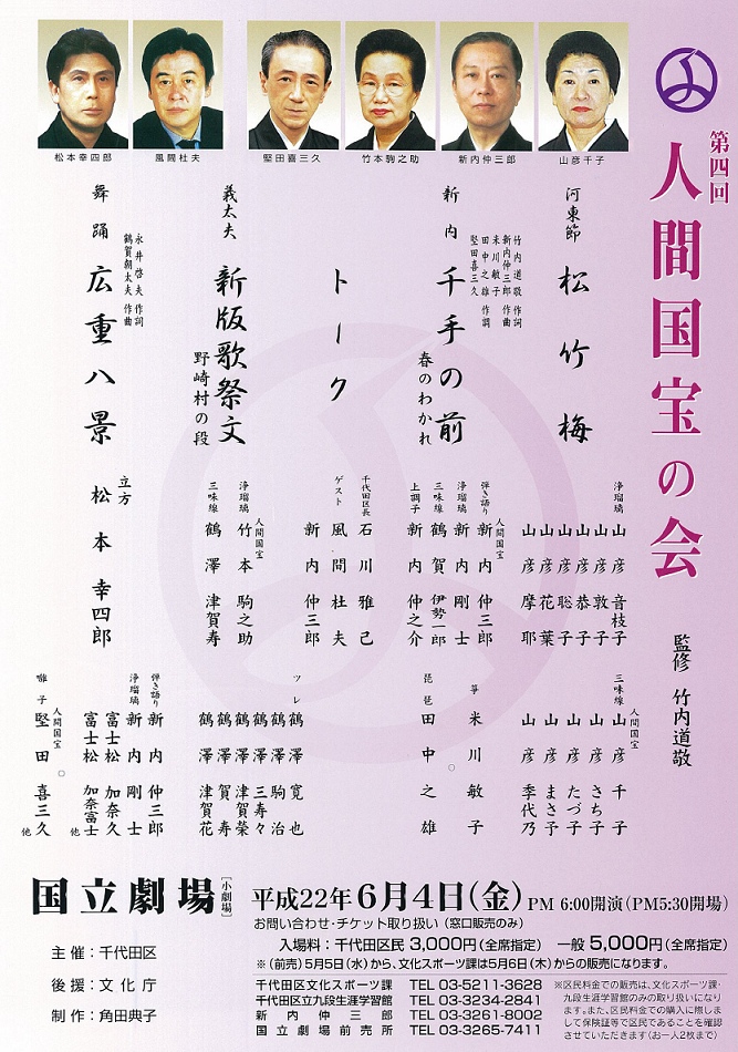 平成22年6月4日(金)国立劇場(小劇場)で開催される第四回「人間国宝の会」に松本幸四郎が出演します。