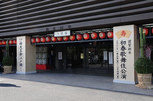 7日までは「獅子舞」、27日までの毎日「手ぬぐいまき」、14日~16日は大劇場2階ロビーに「お茶席」(有料)が設けられるお正月の国立劇場で初春のお芝居をお楽しみ下さい。(上の写真は左より、尾上菊之助、尾上松緑、茂木賢三郎日本芸術文化振興会理事長、尾上菊五郎、中村時蔵)