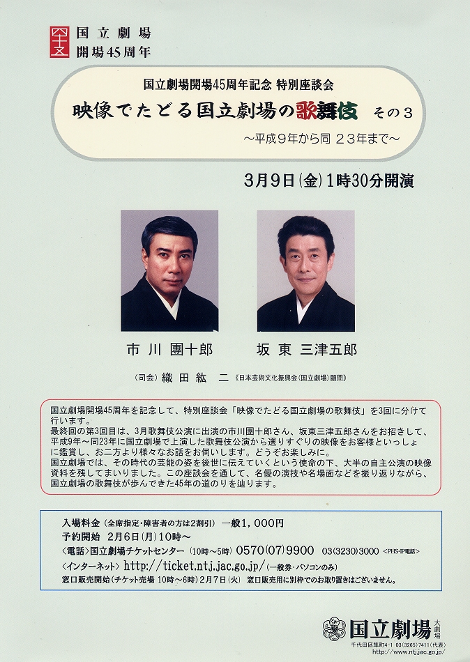 最終回となる3回目に市川團十郎、坂東三津五郎が出席し、平成9年~同23年に国立劇場で上演した歌舞伎公演から選りすぐりの映像を鑑賞、お二人に様々なお話を伺います。