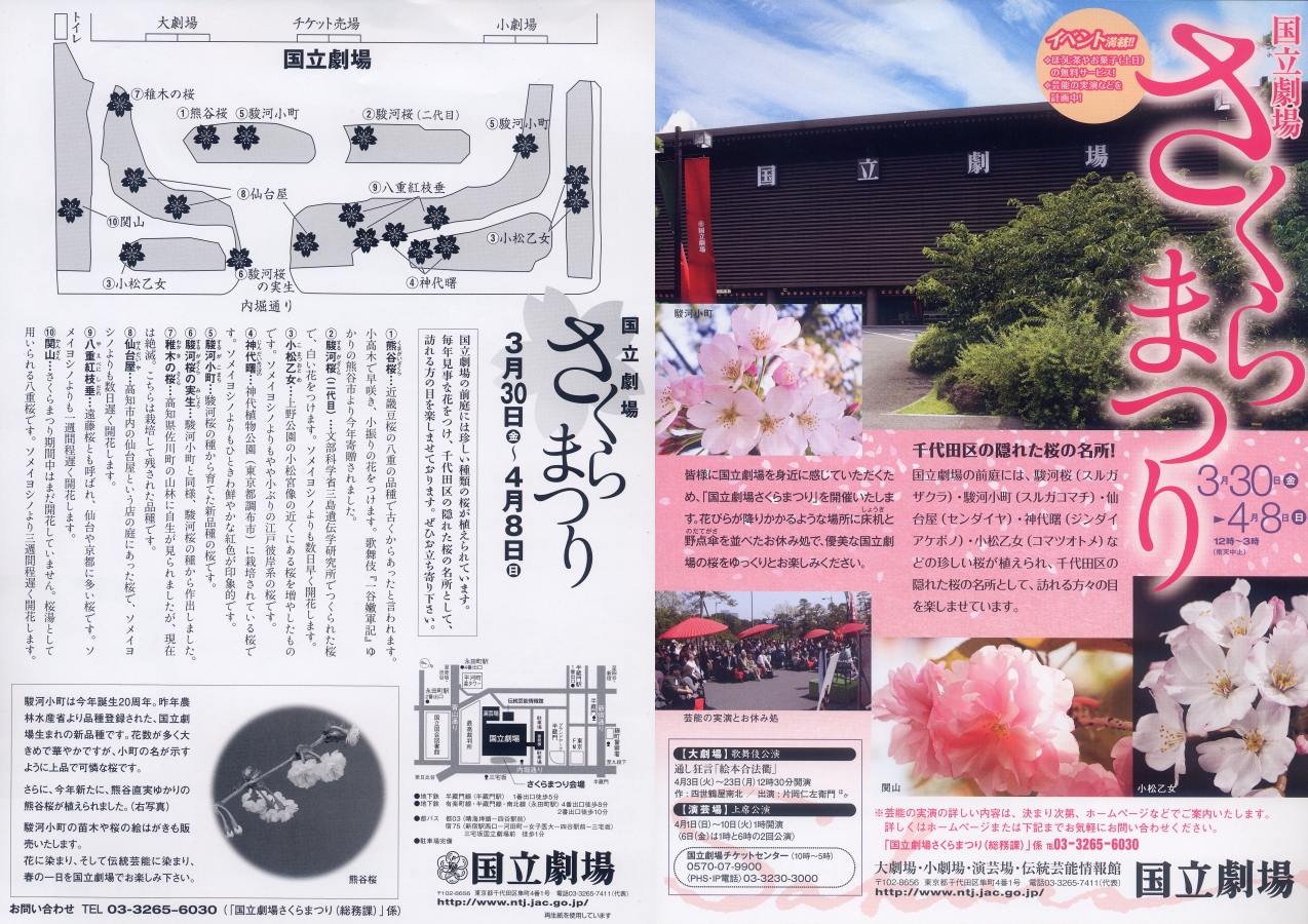 国立劇場の前庭には、駿河桜(するがざくら)、駿河小町、仙台屋(せんだいや)、神代曙(じんだいあけぼの)、小松乙女(こまつおとめ)などの珍しい桜が、毎年見事な花をつけ、互いに競い合うように咲きほこり、桜の多い皇居周辺でも隠れた名所として知られています。今年は3月30日(金)から「国立劇場さくらまつり」が開催されます。詳しくは下記画像をクリックして、チラシをご覧下さい。