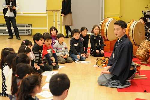 ワークショップは歌舞伎囃子方による演奏や楽器の説明から始まりました。続いて「蜘蛛の糸」の朗読を聞き、効果を高めるために鼓や太鼓を使って、物語に音をつけていきました。子どもたちからは「この部分では鐘の音をならしてもいい?」「ここは楽しいから鈴を鳴らそうよ」などアイディアがたくさん飛び出して、講師達も感心しきり!最後は父兄達を前に、子どもたちが和楽器を使い、朗読にあわせて効果的な「音」をつけ、それによってお話がさらに盛り上がる効果を体験しました。参加した児童からは「(和楽器から)勇気や強さを感じました」「お話だけでも綺麗だけど、音をつけるともっと綺麗」といった感想もあり、みなワークショップを楽しんだ様子でした。