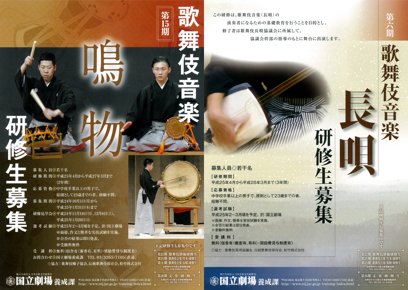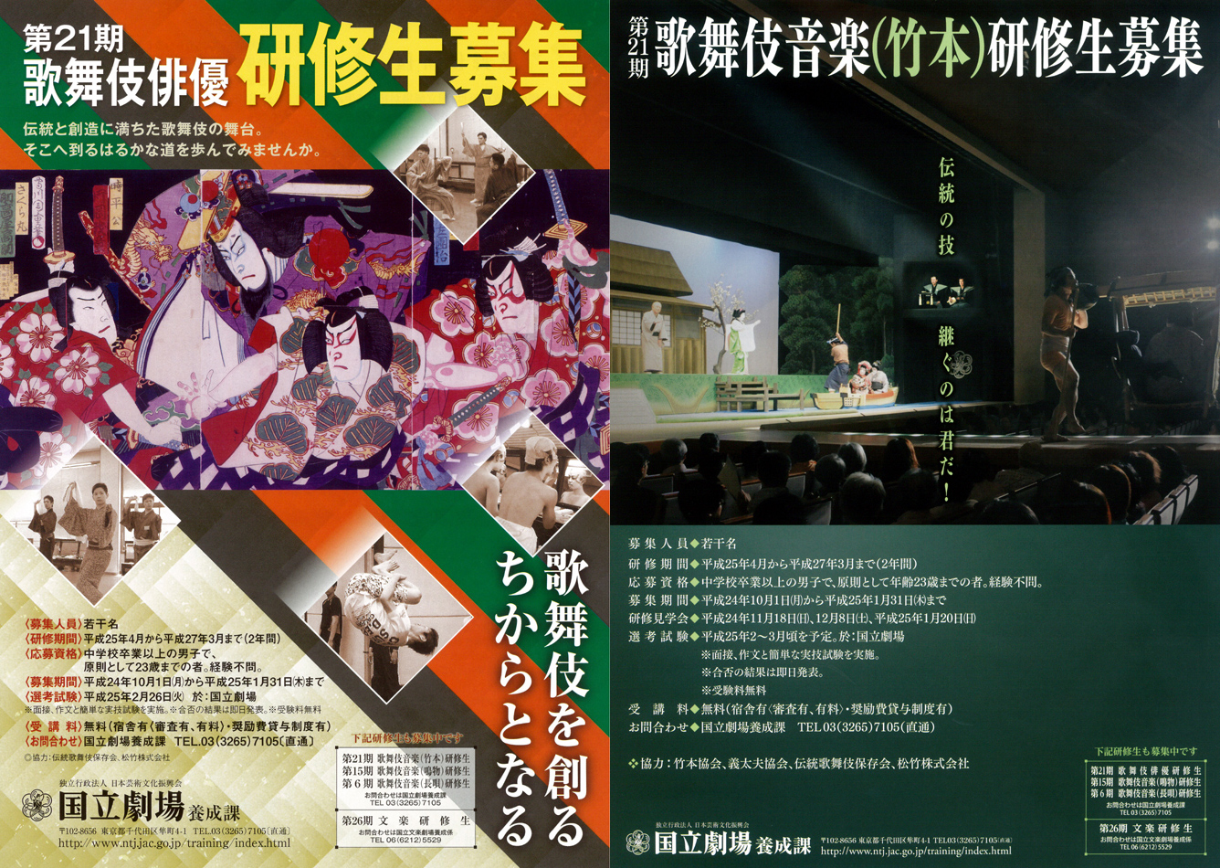 10月1日から、平成25年4月に開講される第21期歌舞伎俳優研修、第21期歌舞伎音楽(竹本)研修、第15期歌舞伎音楽(鳴物)研修、第6期歌舞伎音楽(長唄)研修の研修生募集を開始します。応募資格や方法など、詳しいことは