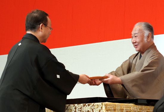歌舞伎キャスター・鈴木治彦氏の司会で式が始まり、坂田藤十郎日本俳優協会会長から各受賞者に賞牌と副賞が贈られ、受賞者へのインタビューが行われた後、来賓の安孫子正松竹(株)専務取締役からご祝辞をいただき終了しました。