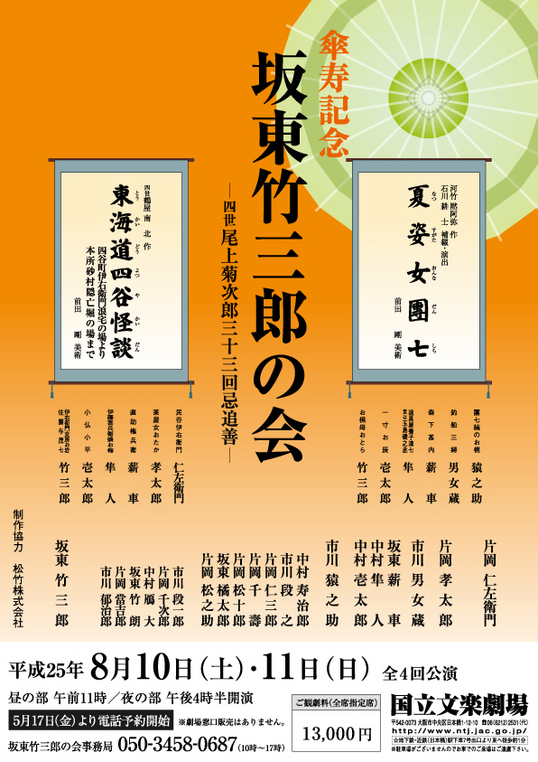 8月10日(土)・11日(日)、大阪の国立文楽劇場で「傘寿記念 坂東竹三郎の会 -四世尾上菊次郎三十三回忌追善-」が開催され、