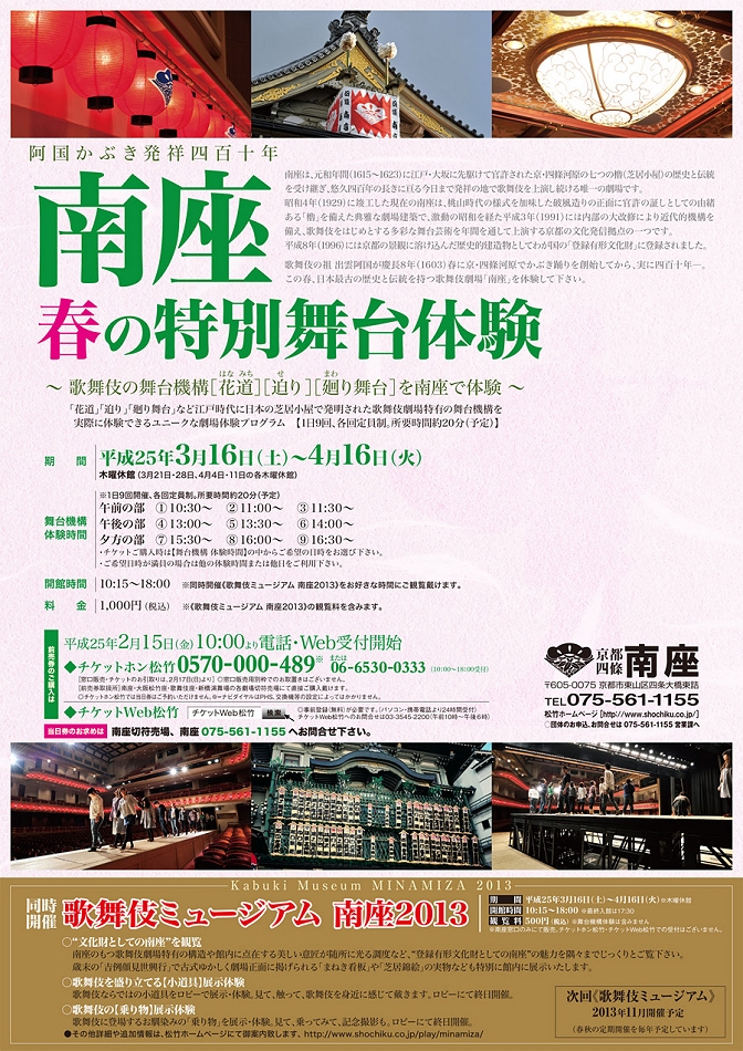 2013年3月16日(土)~4月16日(火)、京都四條南座で、阿国かぶき発祥四百十年「南座 春の特別舞台体験 ~歌舞伎の舞台機構[花道][迫り][廻り舞台]を南座で体験~」が開催されます。