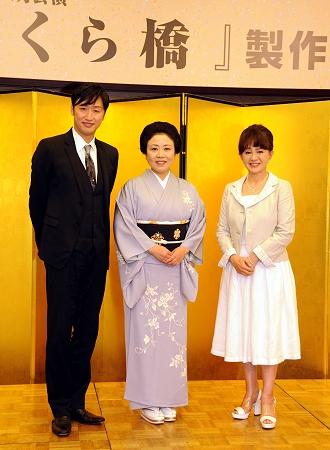 さくら橋』が上演されます。戦後から東京スカイツリーが完成間近の現代までの浅草を舞台に、大阪から上京した河村花を中心とした下町の人々の姿を生き生きと描き出す、笑いと涙たっぷりの物語。主人公・河村花役の藤山直美、「かね升」の女主人・丸井かね役の加賀まりこ、花が思いを寄せる三杉喬役の市川月乃助、補綴・演出の齋藤雅文が製作発表で公演への思いを語りました。