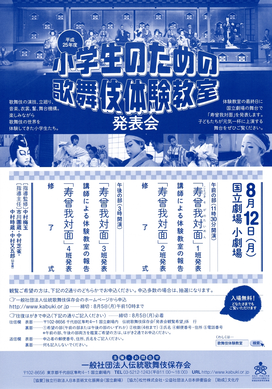 一般社団法人伝統歌舞伎保存会が、夏に開催している「小学生のための歌舞伎体験教室」。今年も小学生たちが11日間にわたって、歌舞伎にまつわる様々な体験をしています。最終日の8月12日(月)には、国立劇場小劇場で『寿曾我対面』の発表会を行います。大きな声で元気良く、短期間でお稽古したとは思えない堂々とした小学生たちの発表は、大変好評です。舞台の合間には、講師の歌舞伎俳優が「体験教室」の授業内容の紹介や、体験の様子を報告します。
