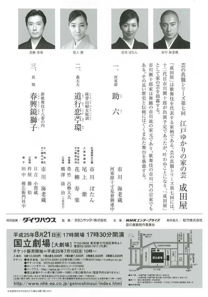> 8月国立劇場 芸の真髄シリーズ第七回「江戸ゆかりの家の芸 成田屋」に海老蔵が出演します