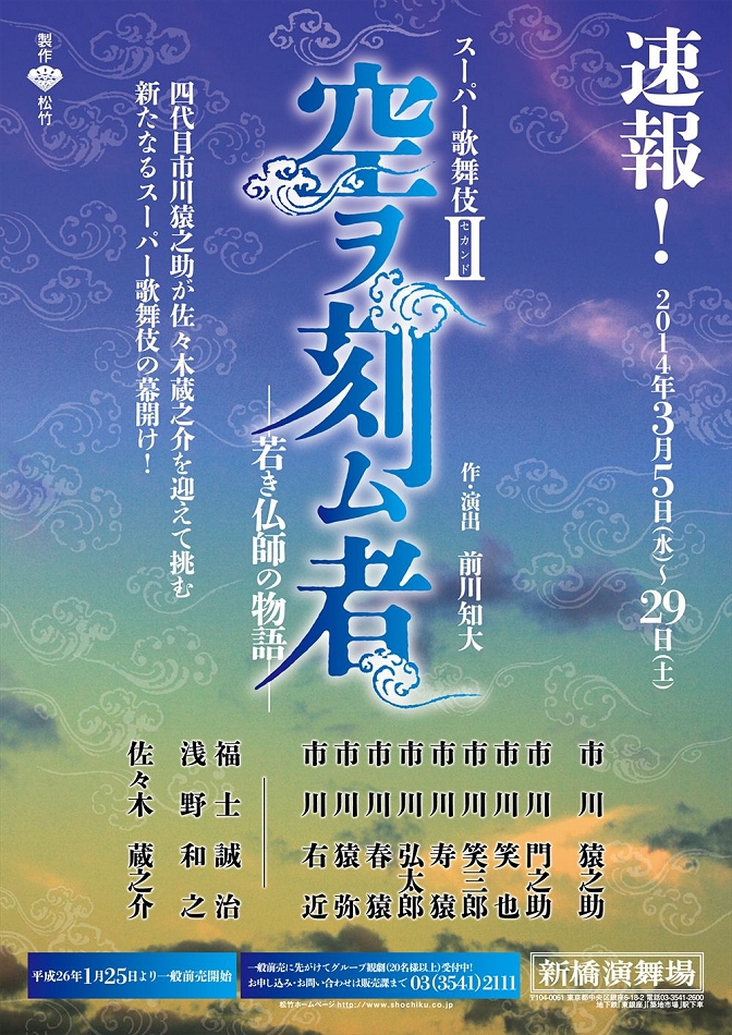 平成26年3月新橋演舞場、4月大阪松竹座で上演される「スーパー歌舞伎II(セカンド)『空ヲ刻ム者 -若き仏師の物語-』」に、
