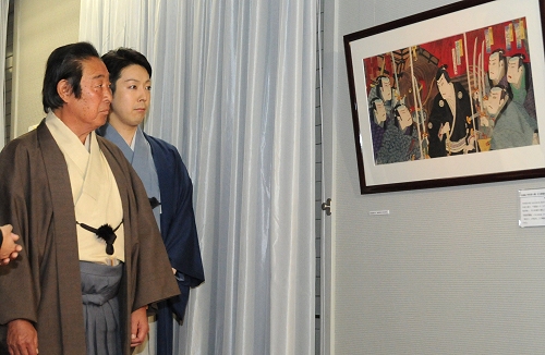 下写真:公演ポスターに使用された錦絵を見学する菊五郎と菊之助