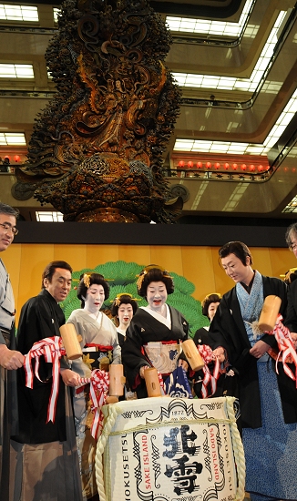 新派のお正月公演は何度も三越劇場で持たせていただいておりますが、例年ささやかに劇場のロビーの中で鏡開きをおこなって参りました。今年やっと夢が叶い、この華やかな1階中央ホールで開催することができました。これを機に三越劇場に大勢のお客様が続々とお集まりくださいます事を願っております。