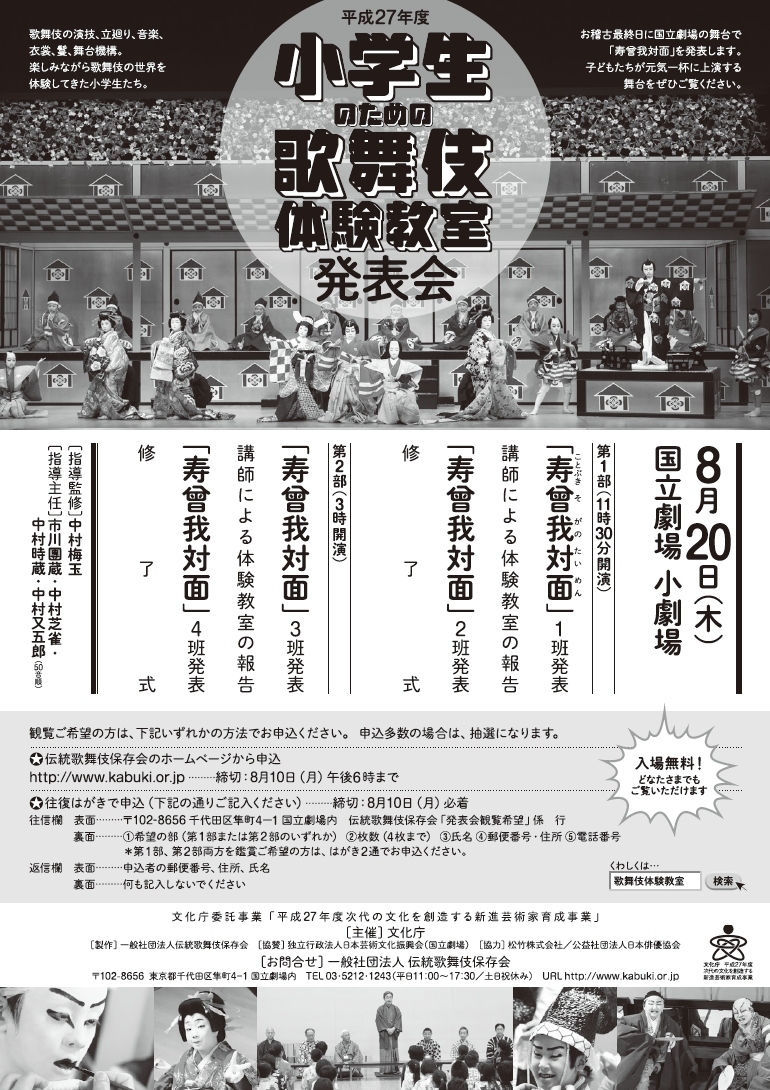 伝統歌舞伎保存会ホームページまたは往復はがきでお申込ください。締切は8月10日(月)です。(※HPは午後6時、はがきは当日到着分まで有効)大きな声で元気良く堂々とした小学生たちの発表は毎年好評です。舞台の合間には、講師の歌舞伎俳優が「体験教室」の授業内容の紹介や、体験の様子を報告します。ぜひご覧ください。