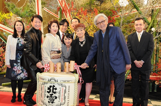 初春新派公演『家族はつらいよ』が初日を迎え、三越劇場本館1階中央ホールにて、出演者と原作・脚本・演出の山田洋次による「鏡開き」が賑々しく行われました。