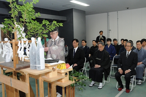 鉄砲洲稲荷の宮司さんによる祝詞とお祓いが粛々と進められ、公益社団法人日本俳優協会の役員を代表して理事の中村又五郎氏、歌舞伎座を代表して支配人の吉浦高志氏、日本俳優協会事務局長の浅原恒男氏、立師代表で中村吉五郎氏、そして名題下の立廻り代表として中村吉二郎氏が順に玉串を捧げ、安全を祈願しました。