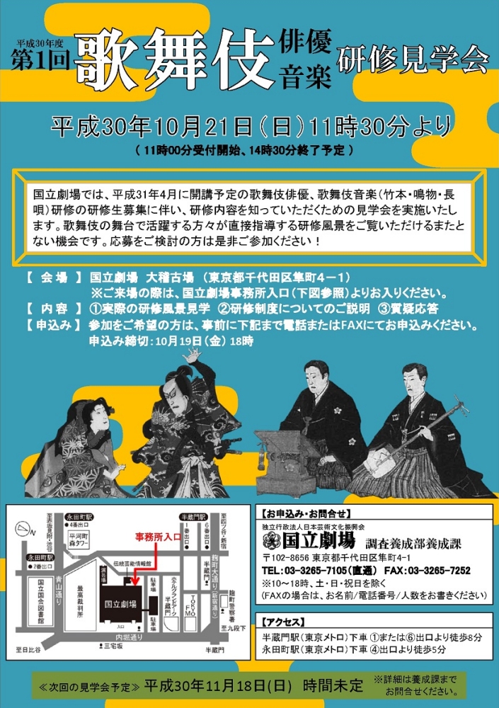 国立劇場では、平成31年4月に開講予定の歌舞伎俳優、歌舞伎音楽(竹本・鳴物・長唄)研修の研修生募集に伴い、研修内容を知っていただくための見学会を実施いたします。