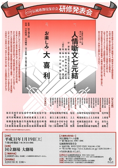 ※研修発表会は歌舞伎の将来を担う若手俳優・演奏家の研修を目的としており、国立劇場の歌舞伎公演で上演されている演目または、若手の研修にふさわしいと思われる演目を選んで上演します。指導には保存会の役員・会員と、同月出演中の幹部俳優・演奏家があたります。