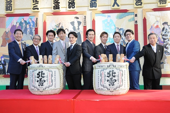 新春浅草歌舞伎で出演者による恒例の「鏡開き」が行われました 2019.01.02発表・会見