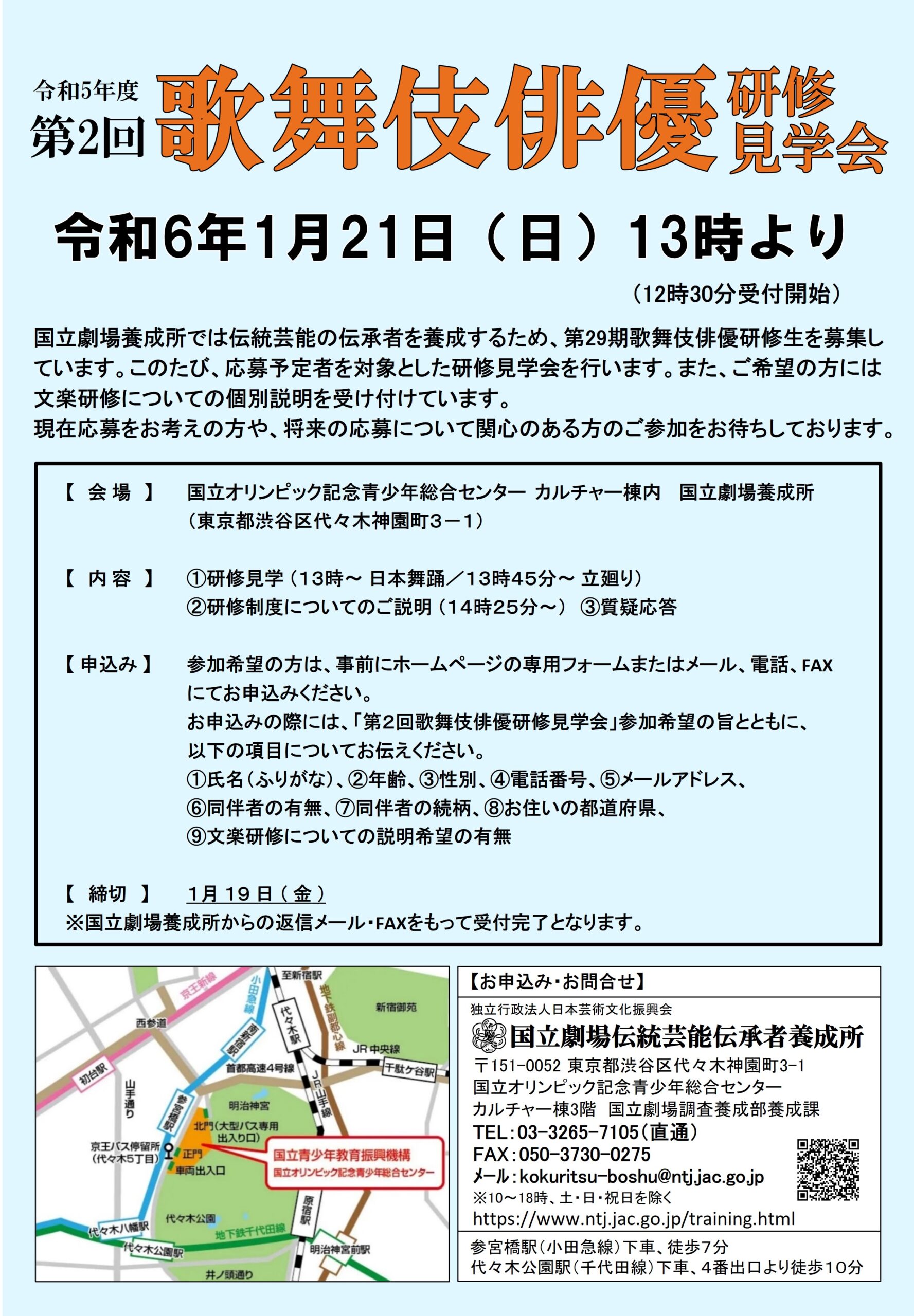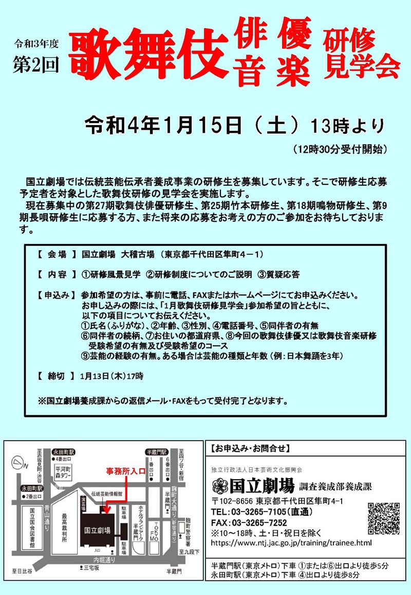国立劇場養成所1月研修見学会開催のお知らせ 2024.12.20募集ほか