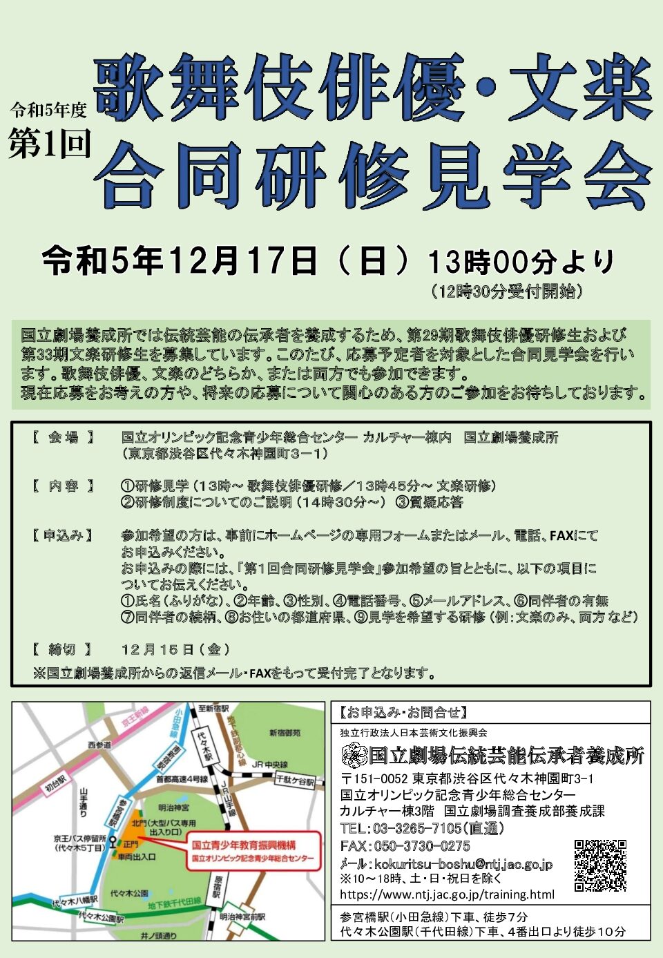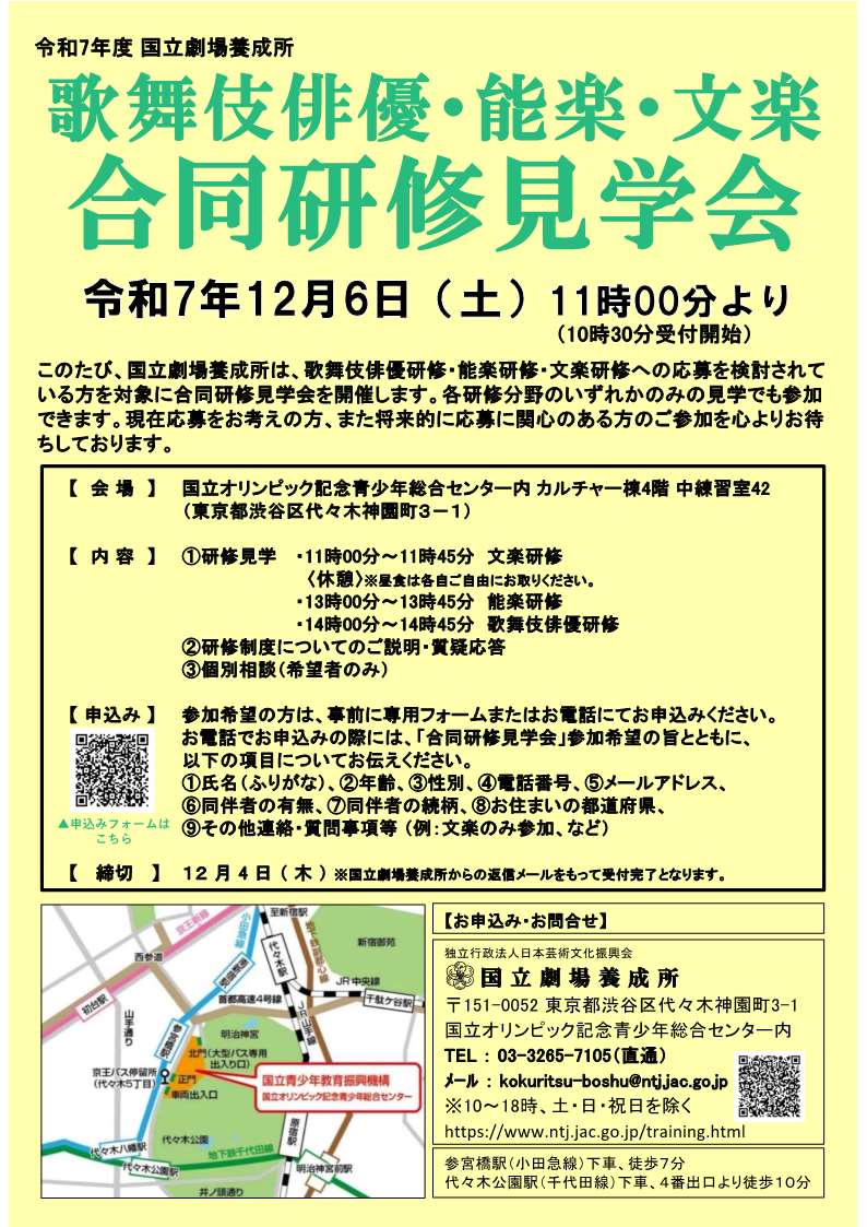 12月6日 国立劇場養成所 歌舞伎俳優・能楽・文楽 合同研修見学会を開催します 2025.11.12募集ほか