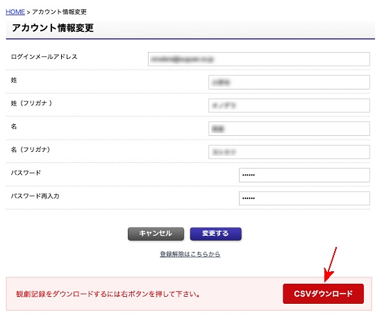 ログイン後、設定変更画面から、CSVダウンロードボタンをクリックすると、自動的にダウンロードが始まります。