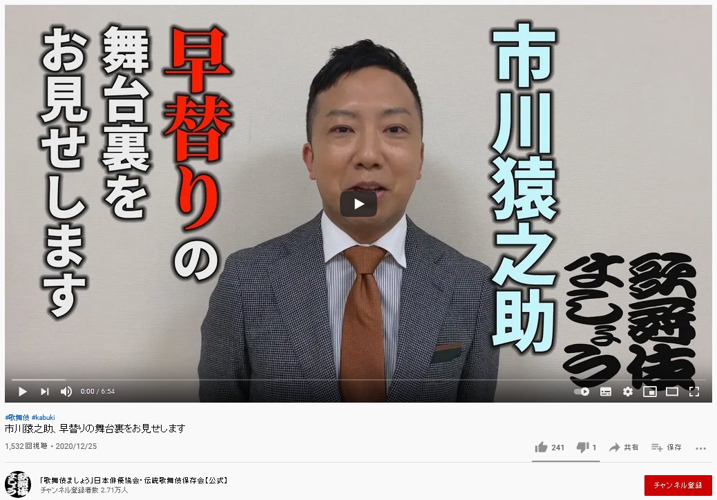 日本俳優協会・伝統歌舞伎保存会公式YouTubeチャンネル「歌舞伎ましょう」動画第49弾を公開しました! 今回は市川猿之助が11月歌舞伎座「吉例顔見世大歌舞伎」で演じた『蜘蛛の絲宿直噺(くものいとおよづめばなし)』の早替りの舞台裏を特別公開した動画です。 下記リンク先で、ぜひご視聴いただければ幸いです。