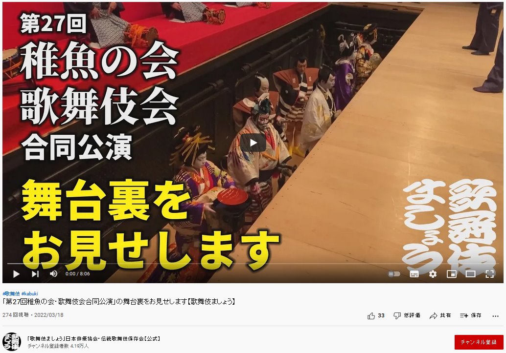 日本俳優協会・伝統歌舞伎保存会公式YouTubeチャンネル「歌舞伎ましょう」動画第70弾を公開しました! 今回は昨年(2021年)8月に国立劇場で開催された「第27回稚魚の会・歌舞伎会合同公演」の舞台裏をお見せする動画です(編集:市川左次郎、構成:中村梅乃・中村橋吾・尾上緑・中村梅寿)。 下記リンク先で、ぜひご視聴いただければ幸いです。