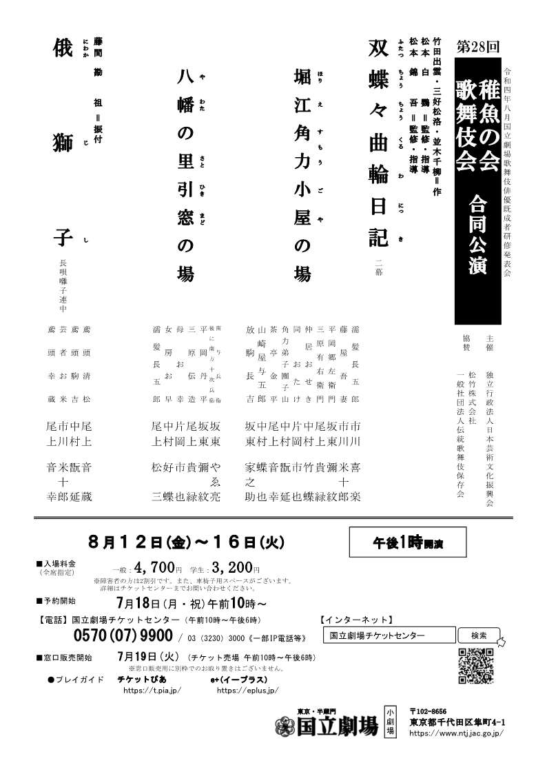2022年8月12日(金)~16日(火)国立劇場小劇場で、第28回「稚魚の会・歌舞伎会合同公演」が開催されます。