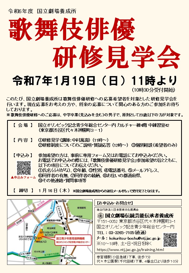 国立劇場養成所では、伝統芸能の伝承者を養成するため、第30期歌舞伎俳優研修生、第26期歌舞伎音楽(竹本)研修生、第19期歌舞伎音楽(鳴物)研修生、第10期歌舞伎音楽(長唄)研修生、第34期文楽研修生を募集しています。
