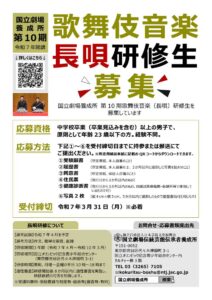 国立劇場養成所では、令和7年開講の第10期歌舞伎音楽(長唄)研修生を、3月31日(金)まで募集中です。