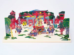 組上燈籠は江戸期から昭和期まで広く流行した錦絵の一種で、 部品を切り出して立体に組み立てて遊ぶことができる現代のペーパークラフトのようなものです。当館では歌舞伎の演目を描いた組上燈籠絵を161点所蔵しており、公式HP内のデジタルアーカイブでも公開しています。この機会に、五枚続の錦絵を 組み上げた大作『車引』完成形をぜひ間近でご覧ください。