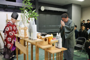 鉄砲洲稲荷の宮司さんによる祝詞とお祓いが粛々と進められ、(公社)日本俳優協会理事の中村芝翫、歌舞伎座支配人の千田学氏が玉串を捧げ、安全を祈願しました。その後、砂場にお神酒をまいてお清めをしてから「返り初め」が行われ、舞台上での激しい立廻りを勤める若手俳優らが、威勢良くトンボを返りました。